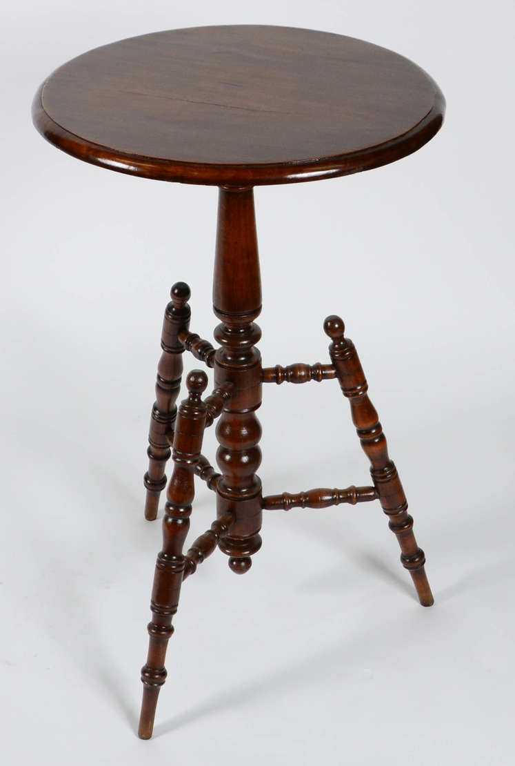 Mesa redonda de madeira nobre com tampo trabalhado, tres pernas cilindricas.