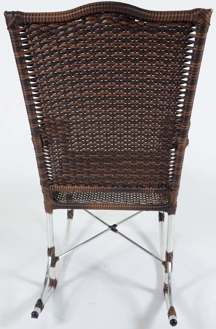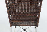 Antiga cadeira em madeira nobre, com braços, assento de palhinha e encosto com régua recortada.