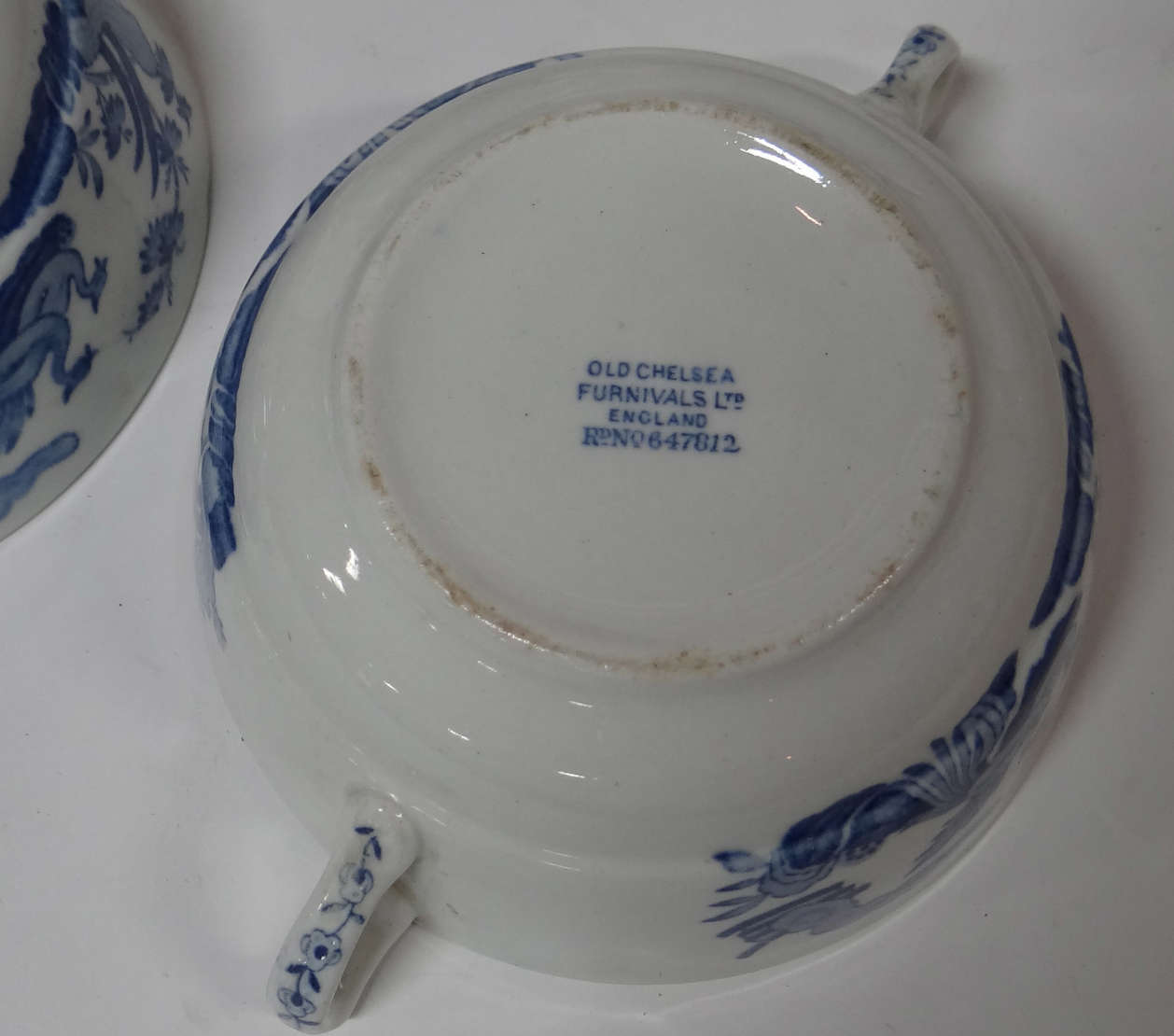 Fruteira em porcelana azul e branco, reservas decoradas com flores e pássaros.