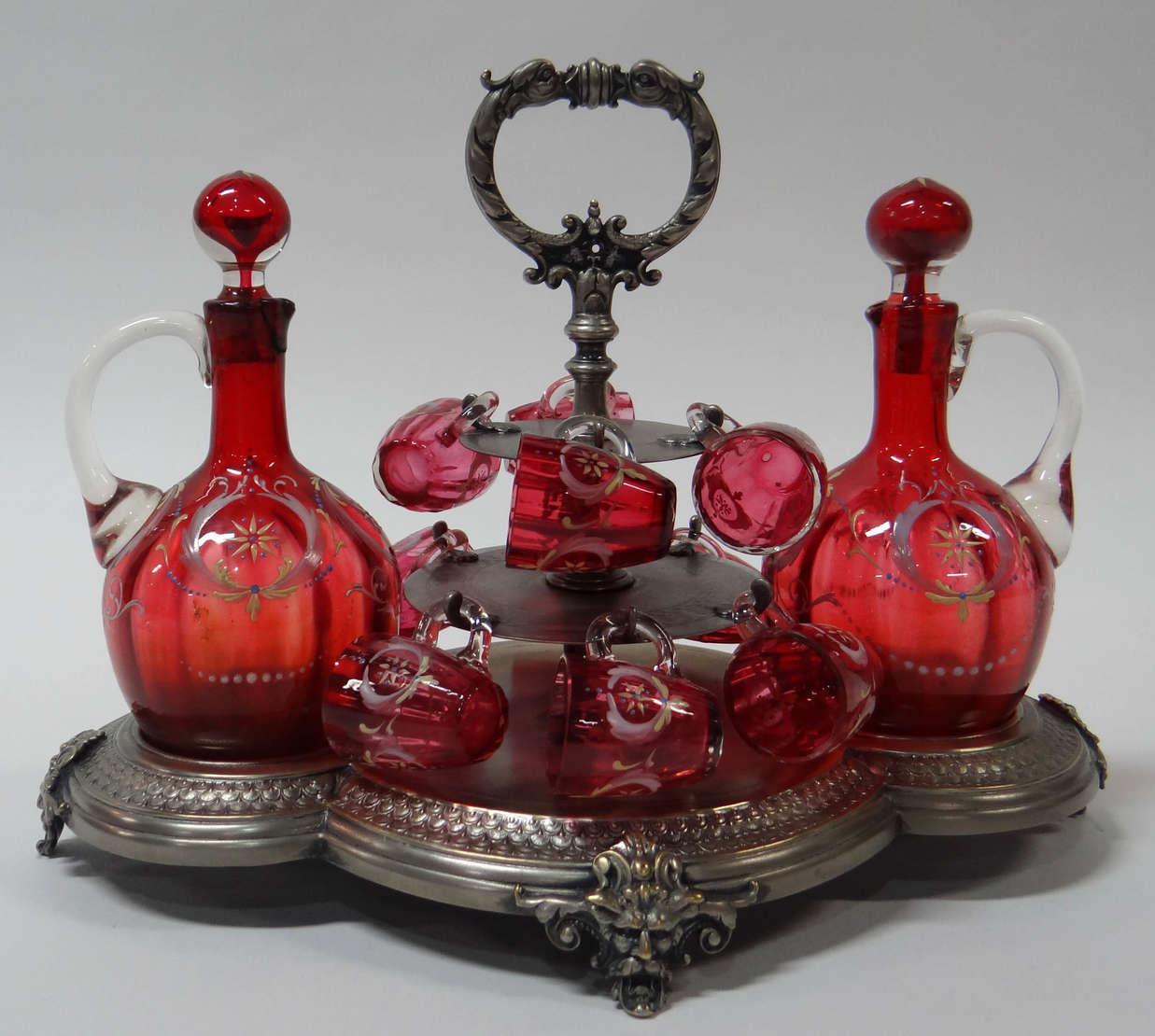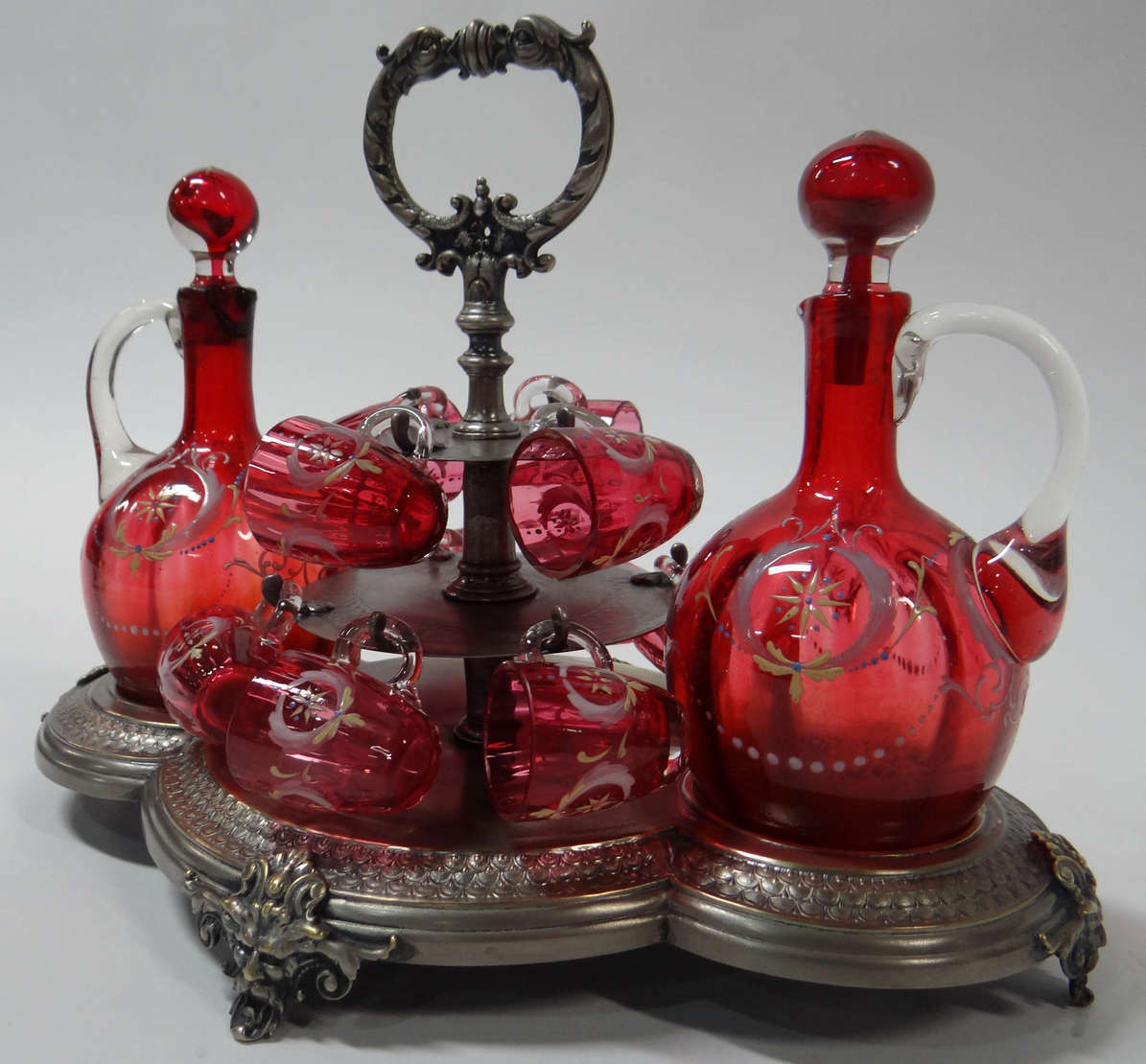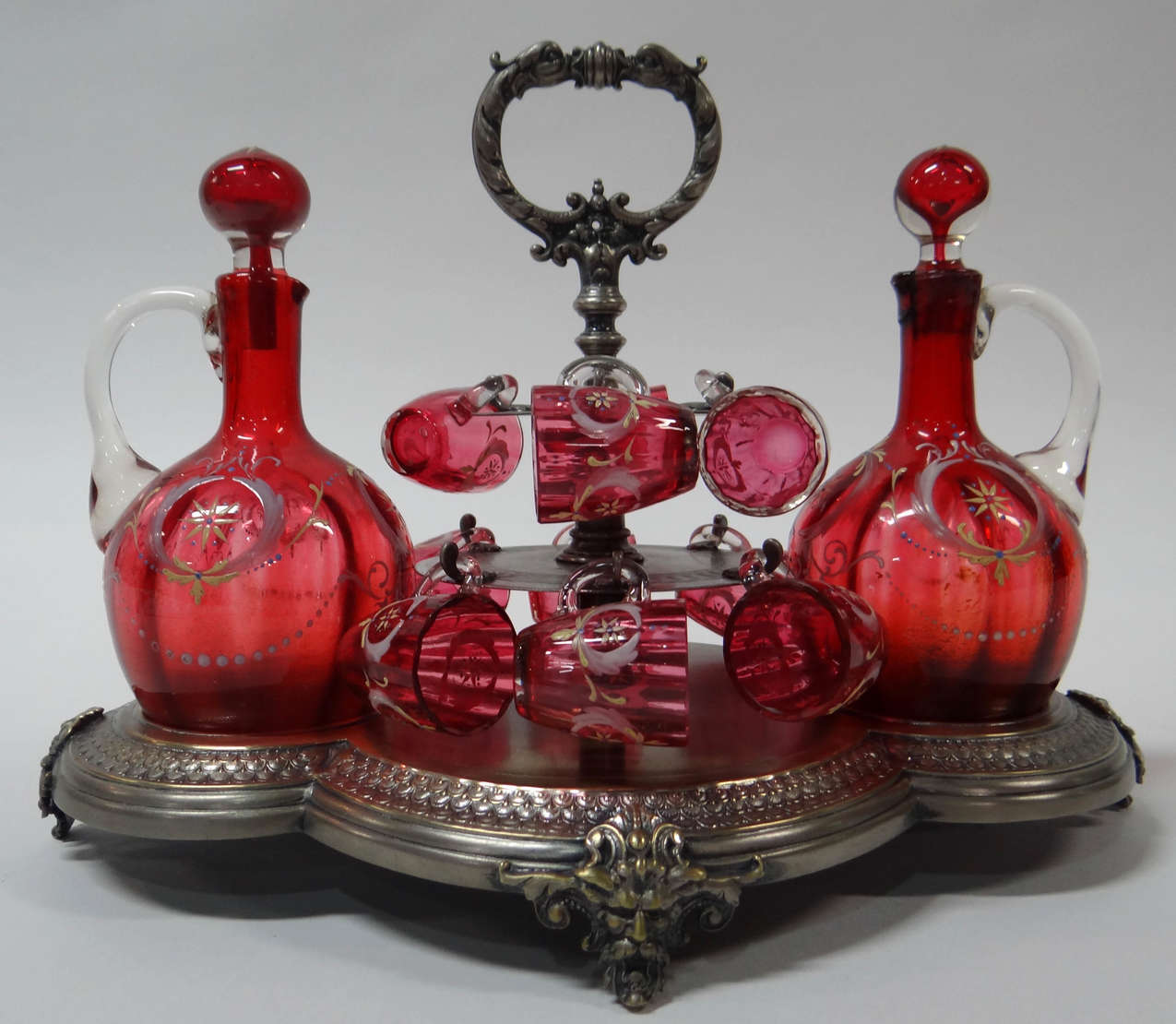 Conjunto com 2 licoreiras de cristal e suporte de metal (uma lascada no gargalo - sem chave)