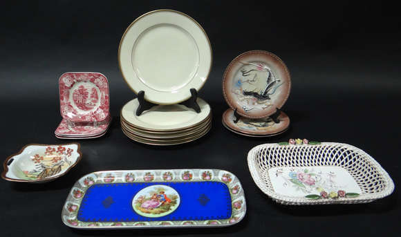 Diversas peças em porcelana ; 6 pratos rasos Rozenthal , fruteira vazada com flores em relevo ; 4 pratinhos inglese...