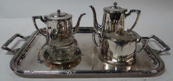 Baixela de prata 90 Wolf para chá e café, composta de dois bules ,leiteira, açucareiro e bandeja . Total 5 peças