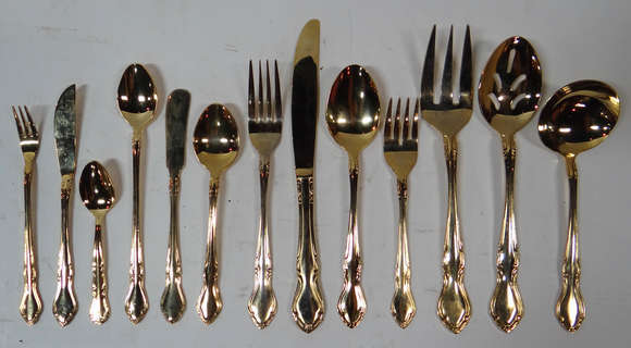 Faqueiro dourado , sendo 12 facas, 12 garfos e 13 colheres grandes ; 12 garfos e 12 facas para peixe ;12 colheres d...