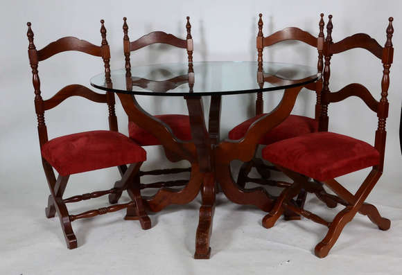 Mesa redonda com base de madeira e tampo de cristal , acompanham 4 cadeiras torneadas com assentos estofados em camur...