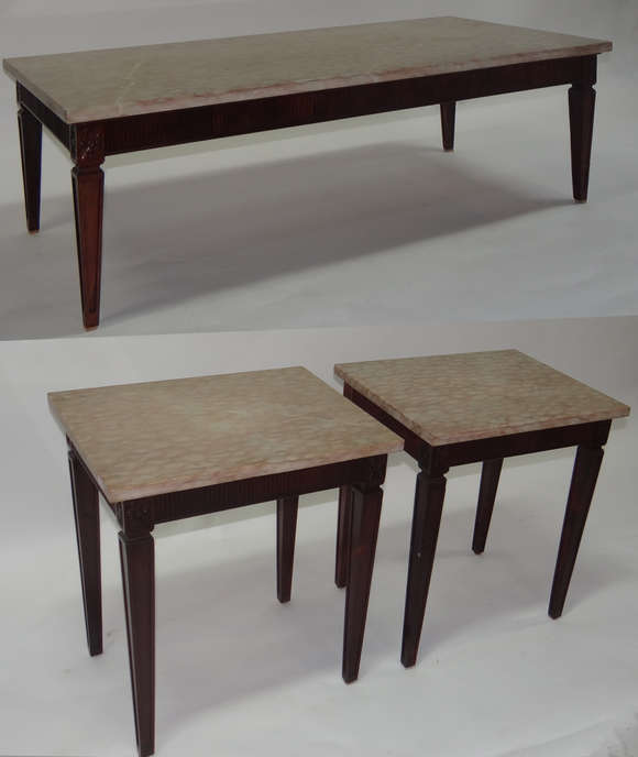 Conjunto de tres mesas de madeira nobre, estilo ingles, tampos de mámore, sendo par de laterais e uma de centro.