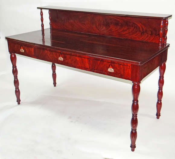 Escrivaninha de madeira nobre, tres gavetas, alçada sustentada por quatro colunetas torneadas, pernas também torneadas.