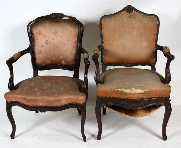 Cadeira com braços de madeira nobre, encosto com tacheados, tecido do assento rasgado, base giratória