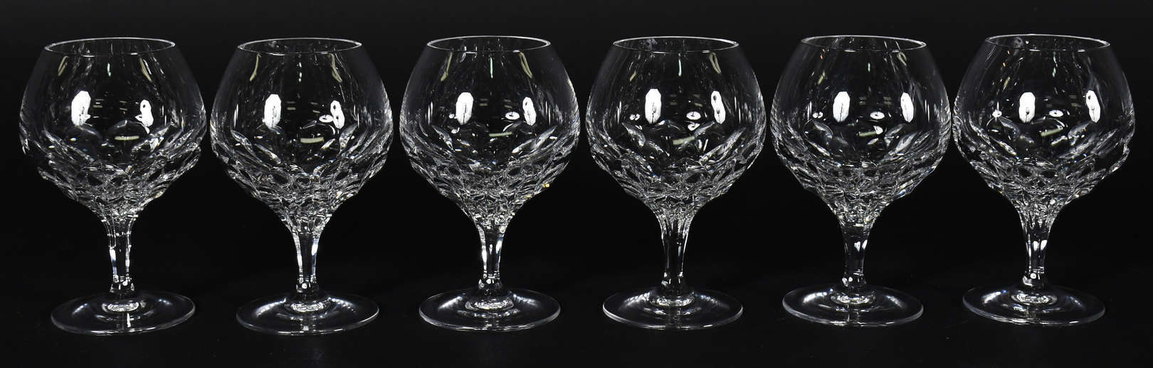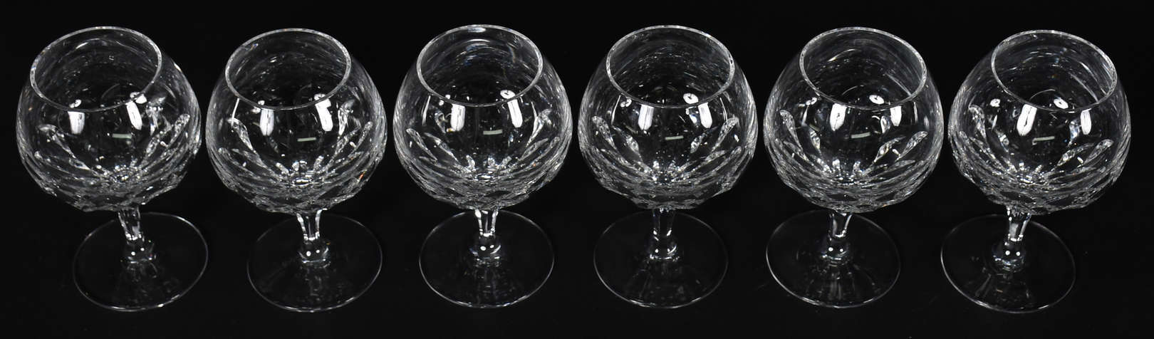Serviço de cálices de cristal com flores lapidadas, marca R na base, sendo 7 taças para champagne, 6 copos para água,...