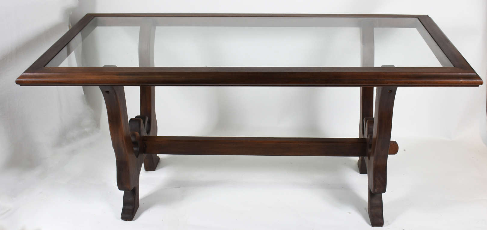 Mesa de jantar de madeira nobre com tampo de vidro e 6 cadeiras com assentos estofados com tecido na cor bege