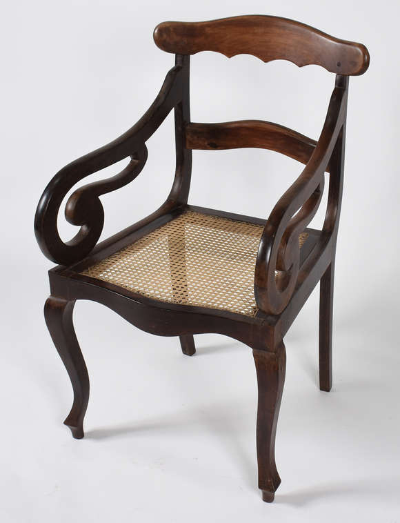 Cadeira mineira de madeira nobre com braços, assento de palhinha sintética.