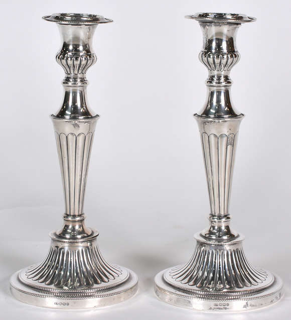 Par de castiçais de prata inglesa contrastada, feitio gomado, peso total (com enchimento interno) ( Por segurança a...
