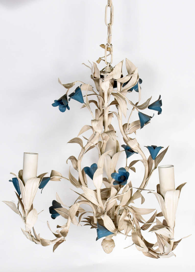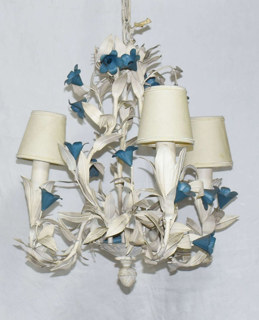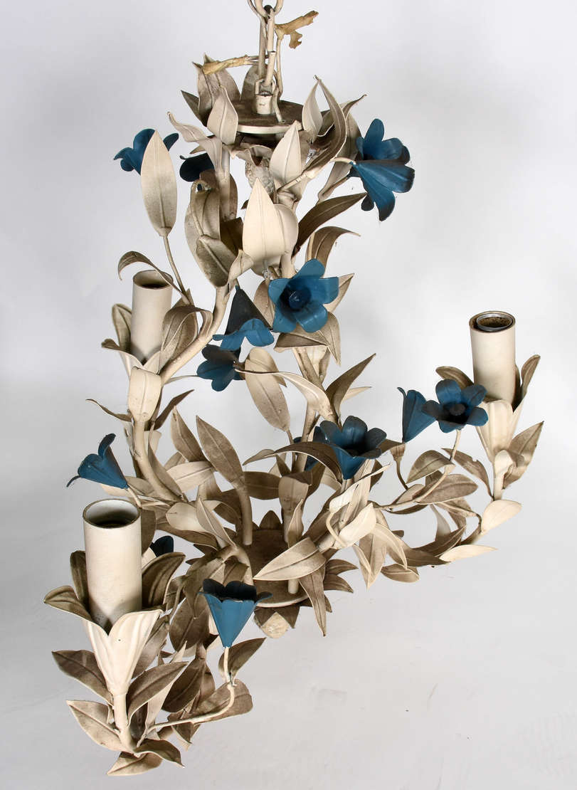 Lustre para seis luzes com folhas de metal e pequenas mangas de pergaminho.