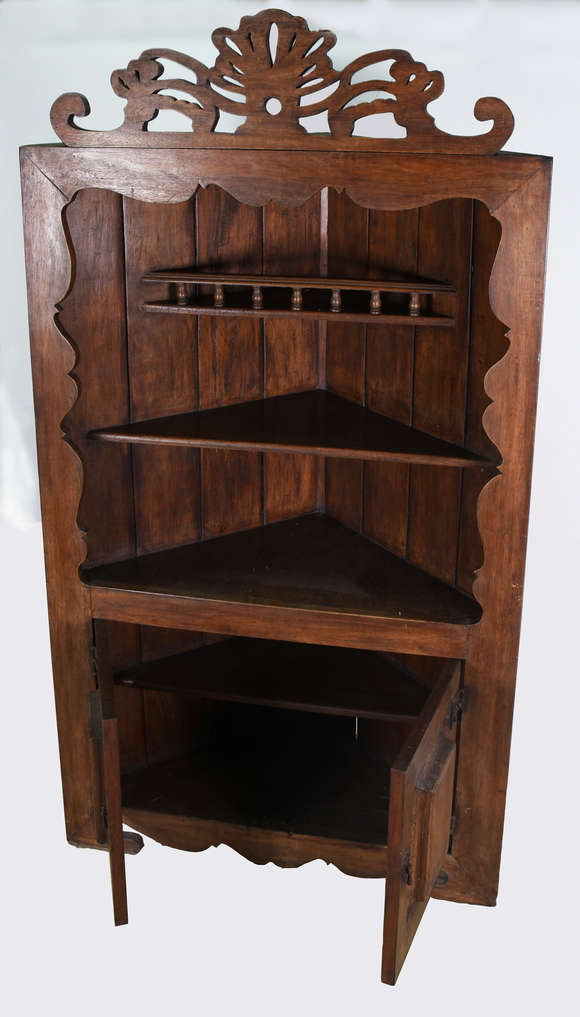 Móvel de canto em madeira nobre, estilo colonial brasileiro, duas portas almofadadas na parte inferior. alçada com pr...