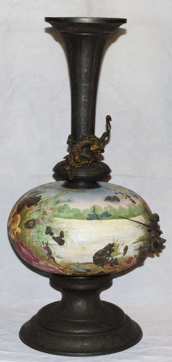 Rara ânfora Francesa Art Noveau, séc XIX , confeccionada em pewter e faiança pintada á mão com apliques em relevo rep...