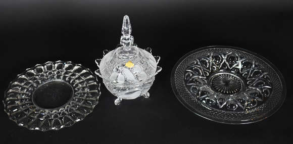 Tres peças, sendo : Dois pratos de vidro e bomboniere de cristal lapidado.