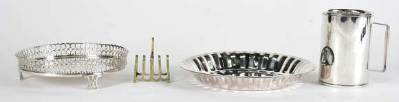 Quatro peças de metal , sendo bandeja com gradinha , jarra e salva e porta guardanapo.