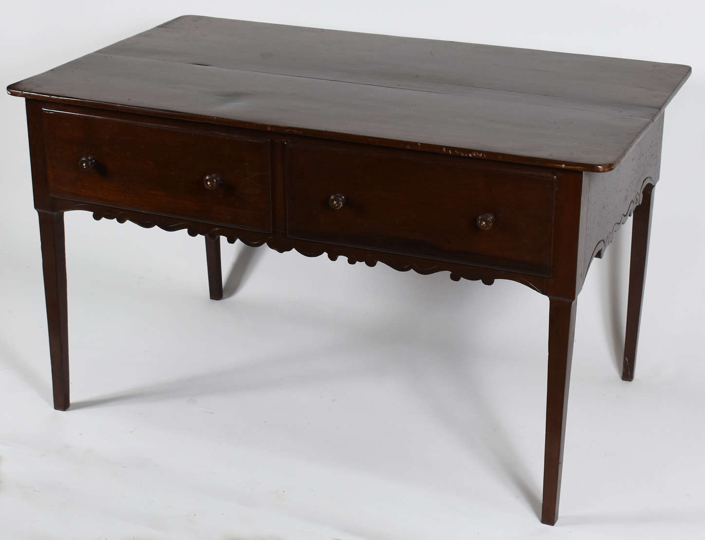Mesa de madeira nobre , tampo retangular apoiado sobre 4 pernas cilíndricas ligadas por traves inferiores recortadas ...