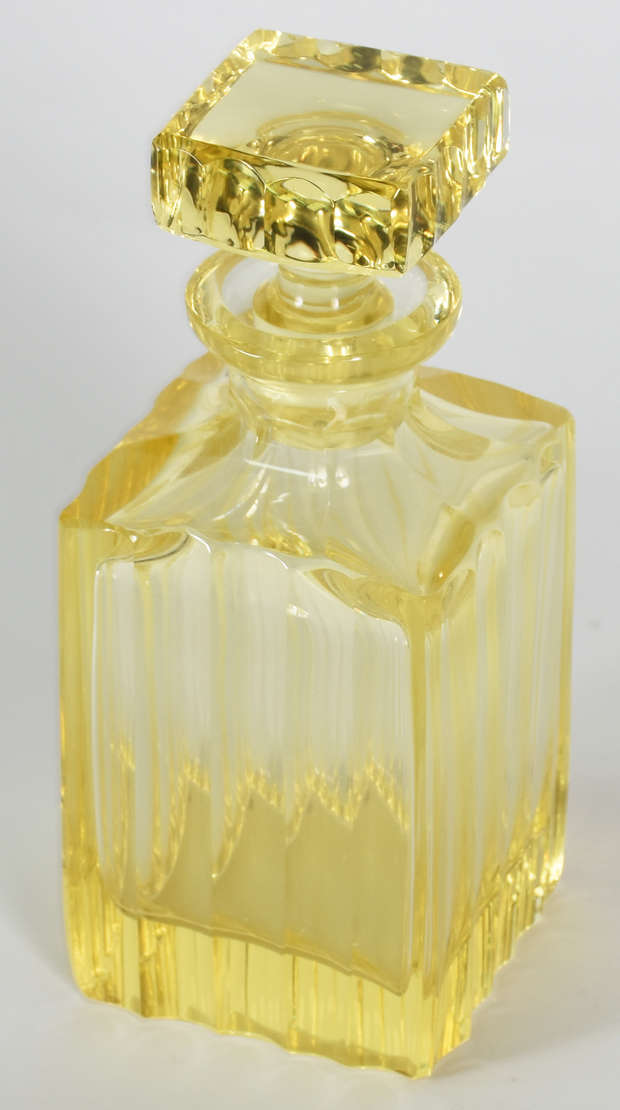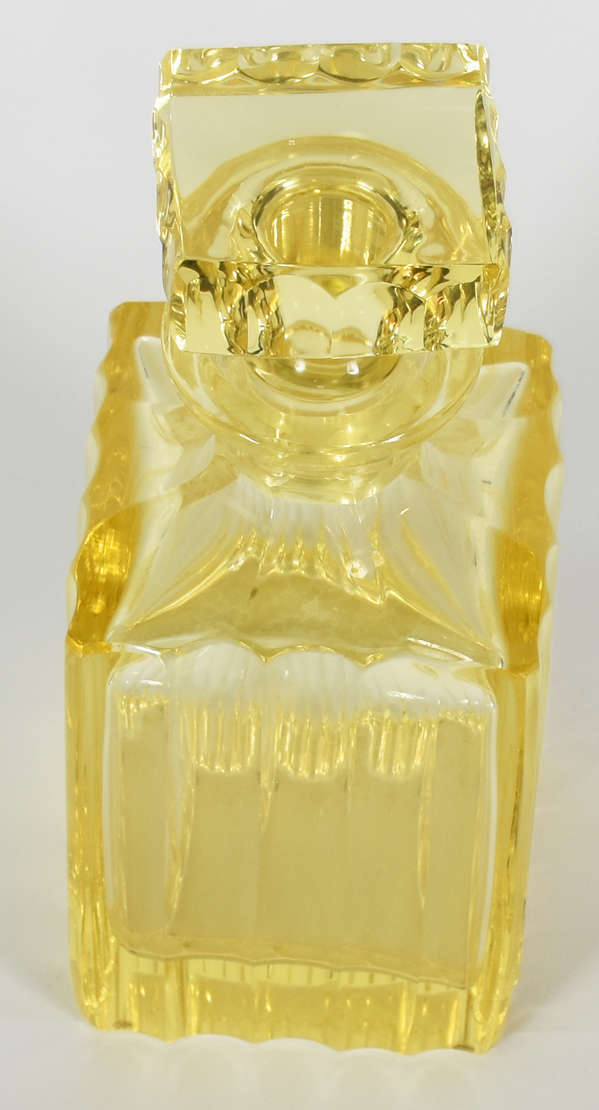 Garrafa feitio quadrangular em bloco de cristal europeu na cor amarela.