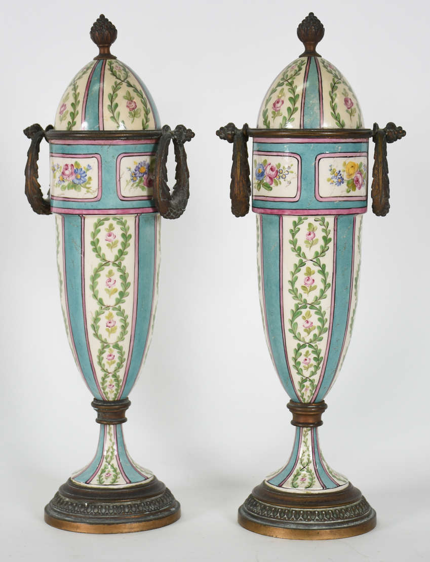 Vaso decorativo de cerâmica policromada com base e borda de prata contrastada.