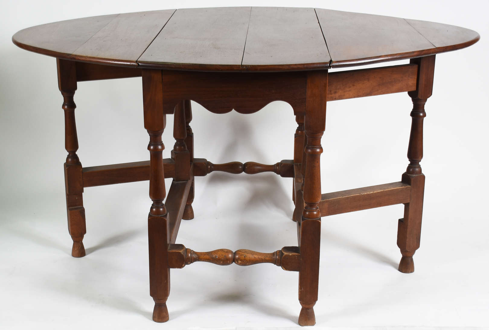Mesa de jantar de madeira nobre estilo Inglês, apoio em 4 colunas frisadas ligadas por traves inferiores, ponteiras e...