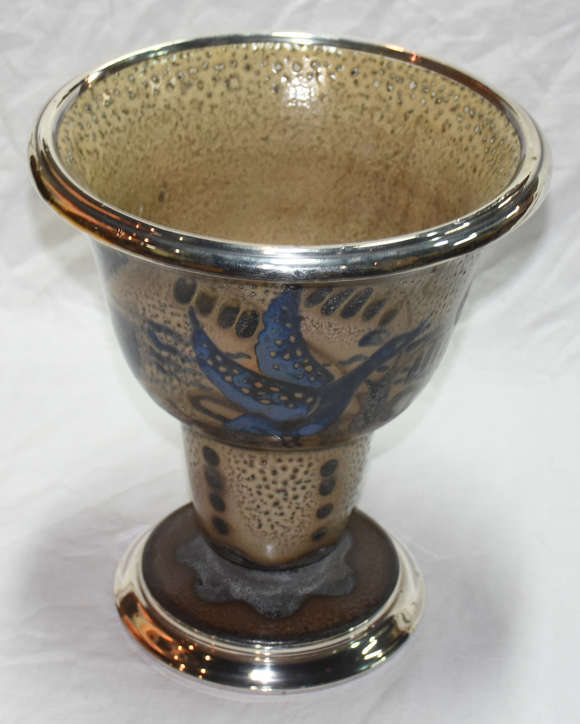 Vaso decorativo de cerâmica policromada com base e borda de prata contrastada.