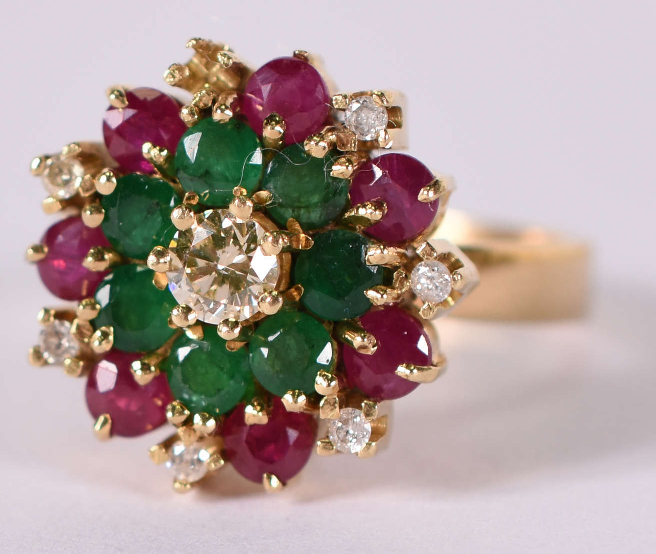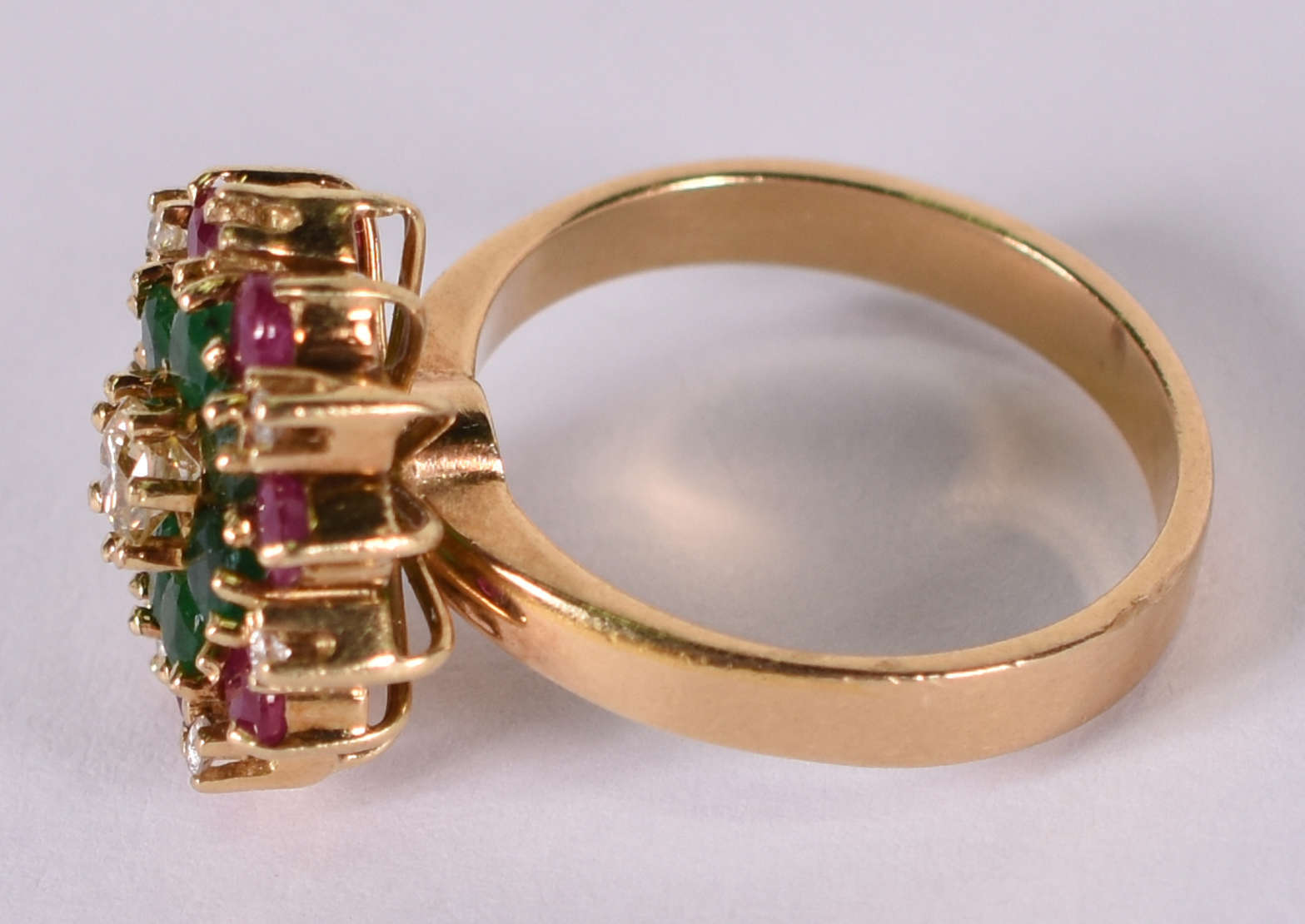 Anel de ouro amarelo com brilhante, esmeraldas e rubilitas Aro 14 ( Por questão de segurança, a peça não se encontra...