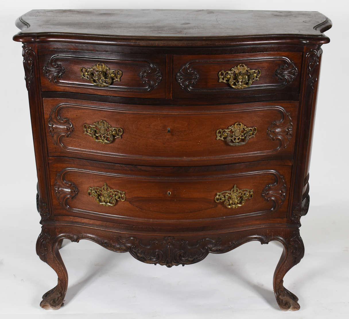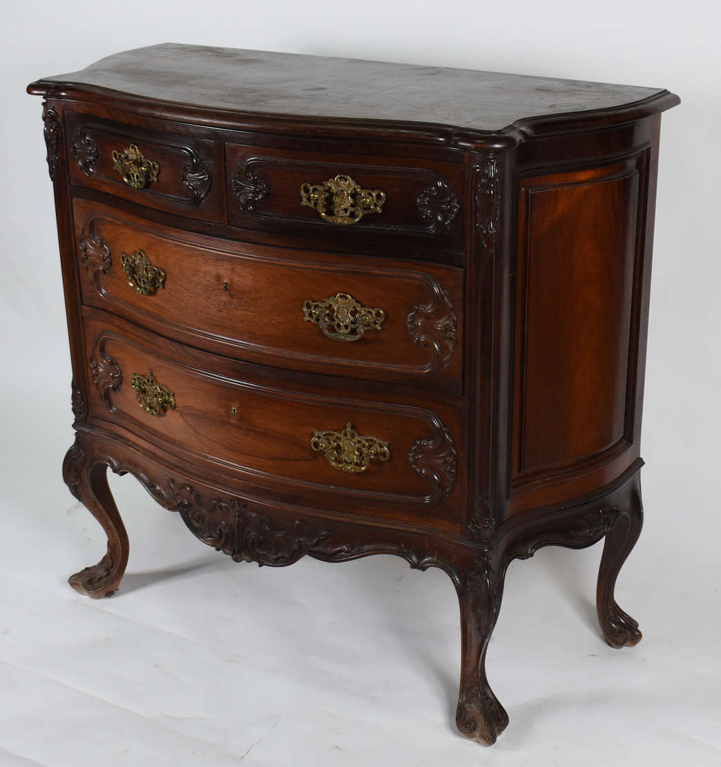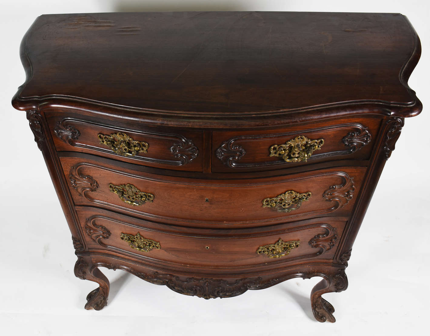 Escrivaninha de madeira nobre, estilo Chipendale, com 4 gavetas
