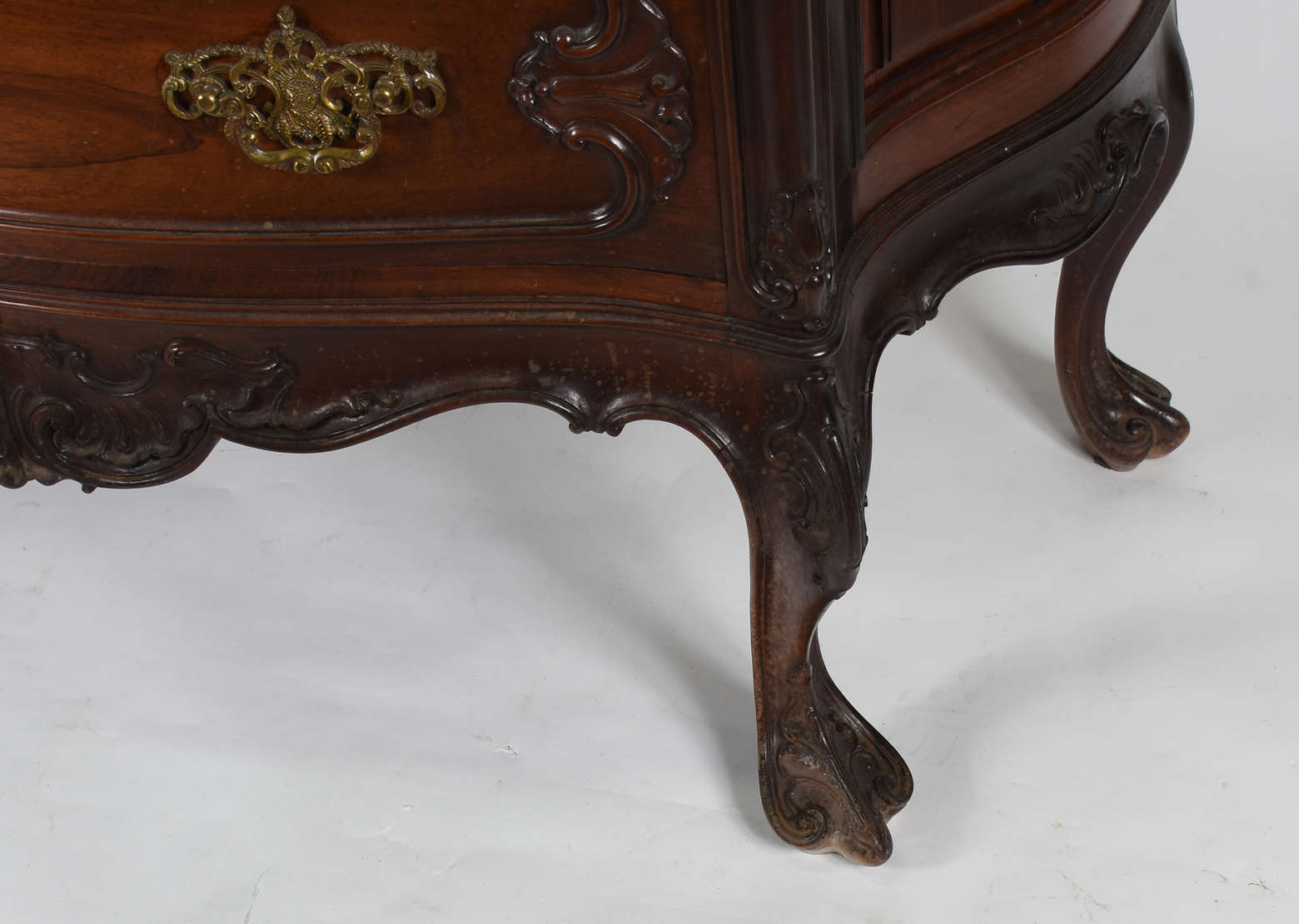 Vitrine estilo Luis XV de madeira nobre patinada, flores em relevo com leve policromia, prateleira internas de vidro...