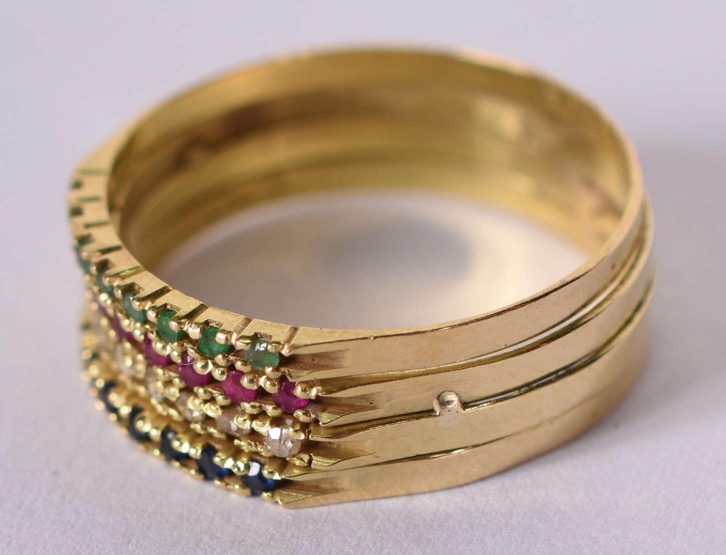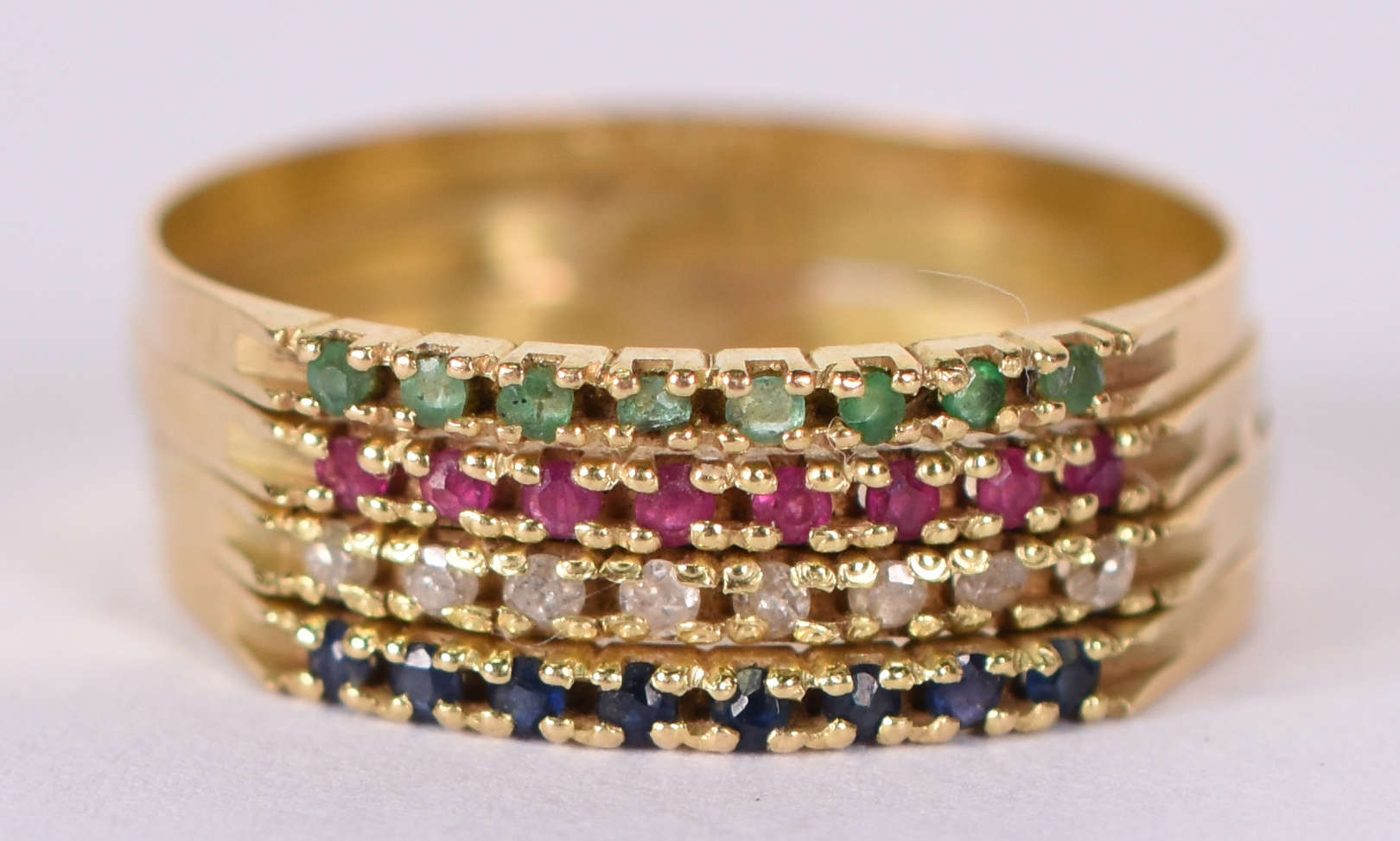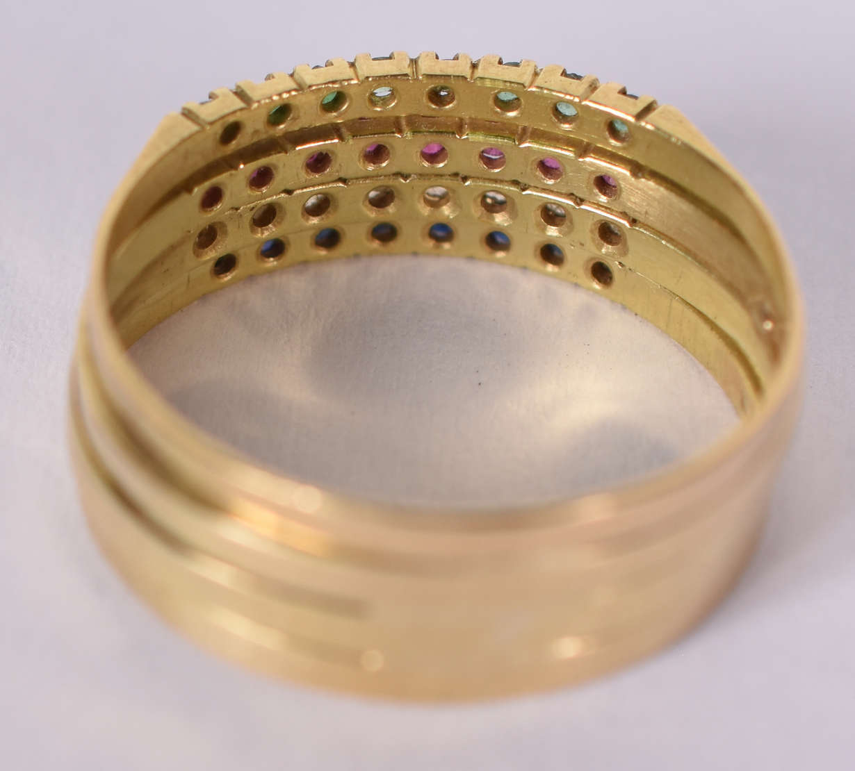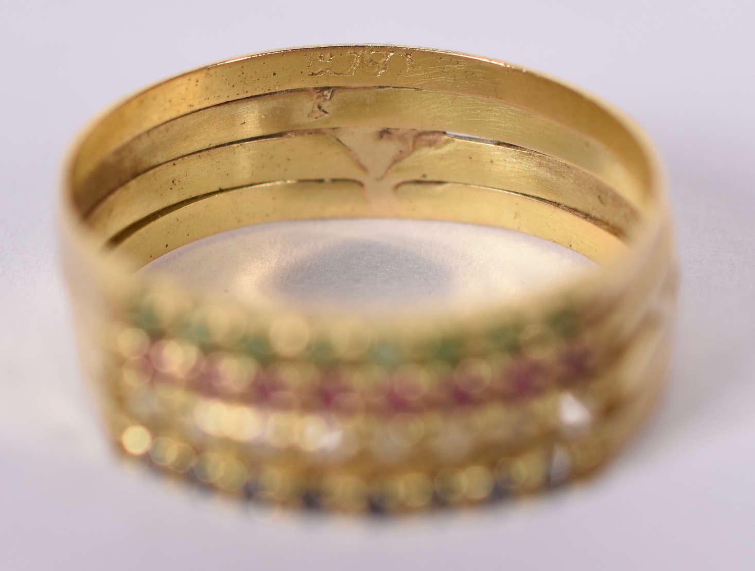 Anel de ouro 18 K com esmeraldas, rubis e brilhantes ( faltando uma pedra ) Aro 19 ( Por questão de segurança a peç...