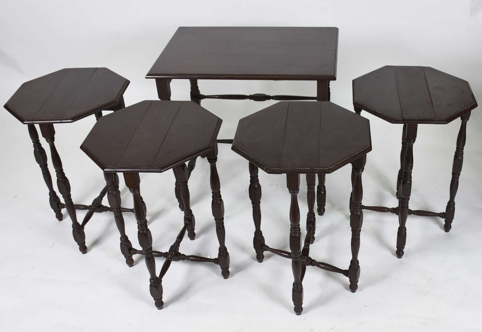 Mesa sextavada de madeira nobre com tampo trabalhado em marqueterie, estilo mourisco.
