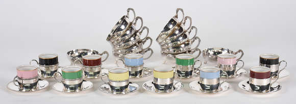 Conjunto com Doze xícaras para café com base e pires de metal prateado e interior de porcelana e, 12 taças para sorve...