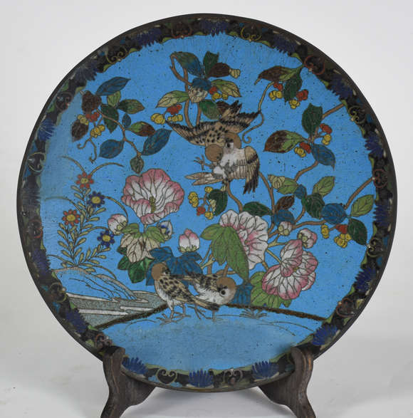 Antigo Prato de cloisoné chines azul decorado com flores e pássaros em policromia.