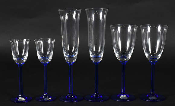 Conjunto de taças de vidro com pé azul , sendo 6 para vinho , 5 para licor e 6 flutes . Total 17 peças