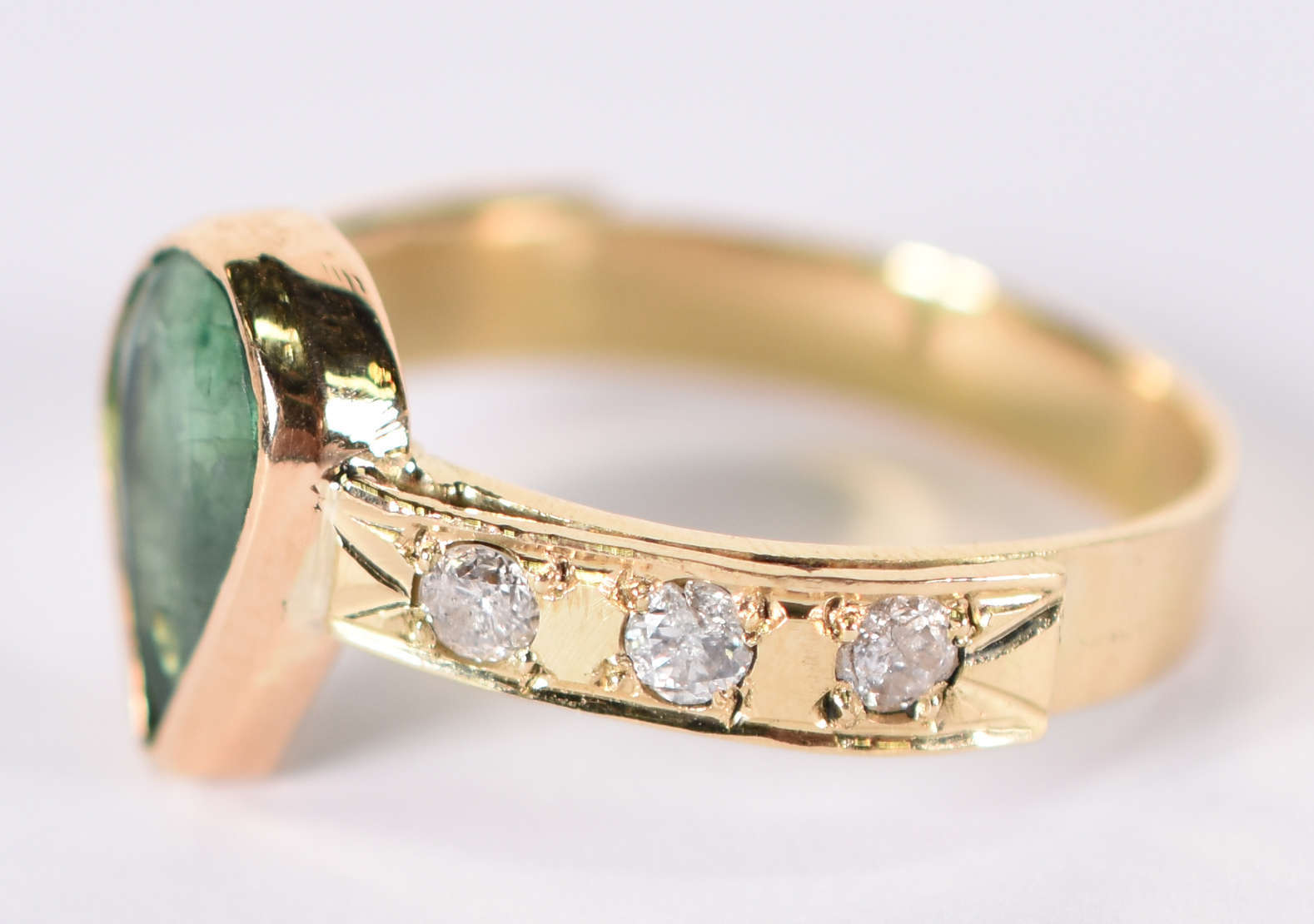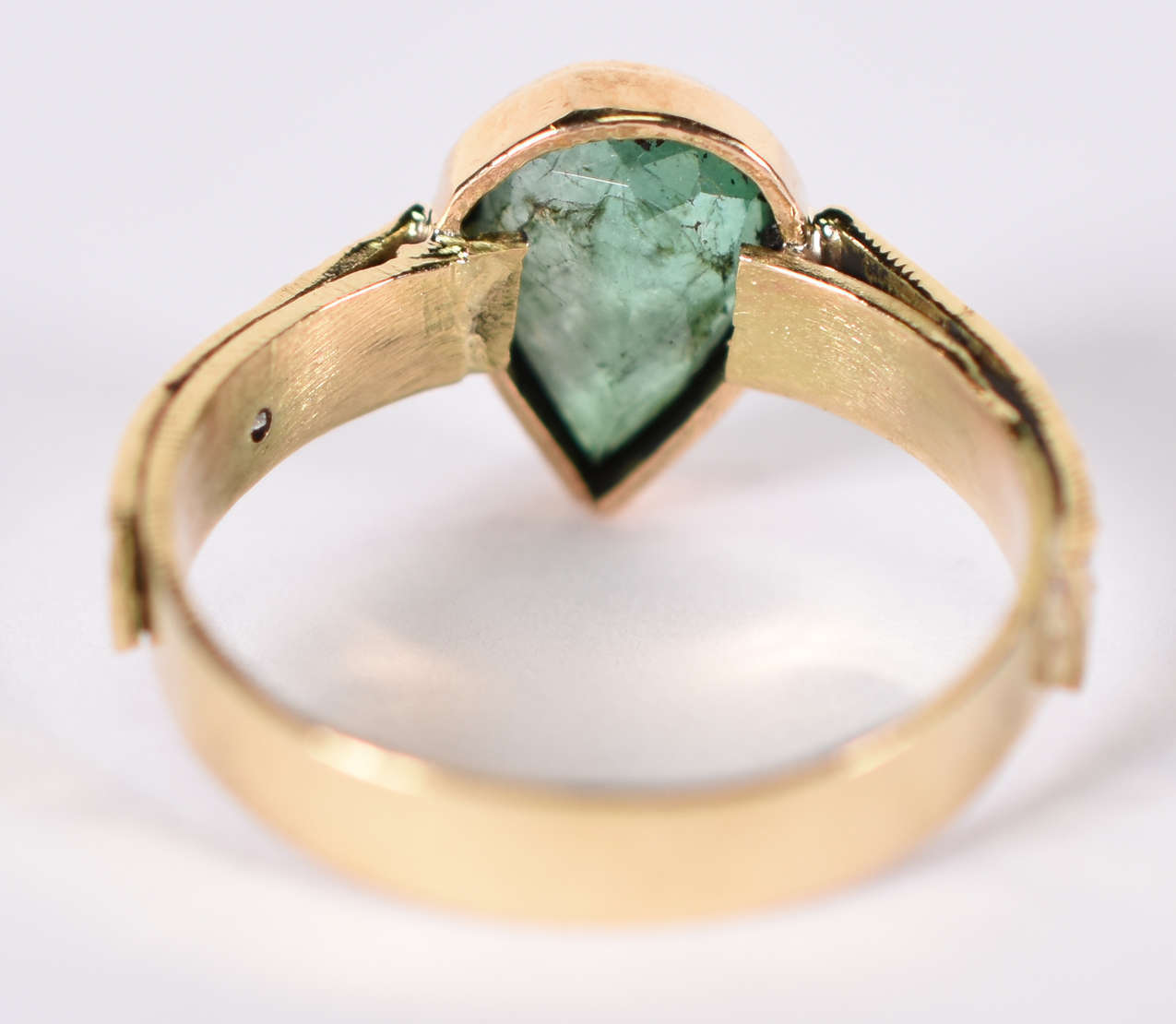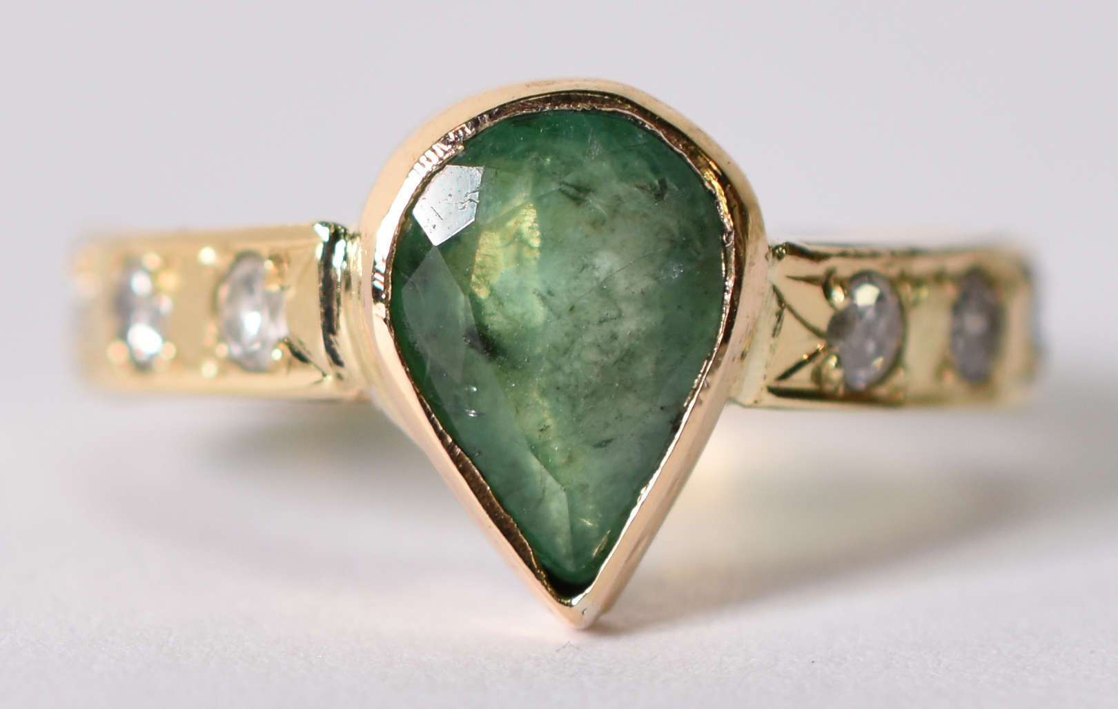 Anel em ouro 18 K com 1 esmeraldas e 8 brilhantes . Aro 18 ( Por questão de segurança a peça não se encontra na loja)