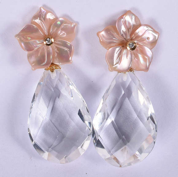 Par de brincos de ouro com pedras tipo flor , pingentes de cristal tipo gota e 2 brilhantes ( Por questão de segura...
