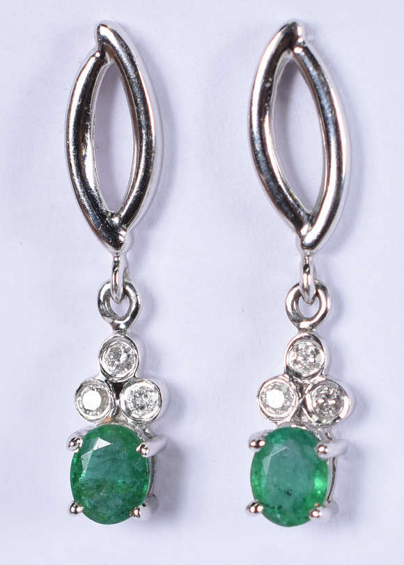 Par de brincos de ouro branco com 6 brilhantes e 2 esmeraldas ( Por questão de segurança a peça não se encontra na ...