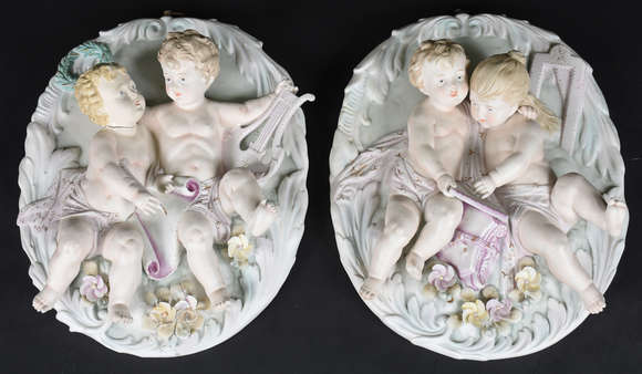 Par de placas de biscuit europeu policromado representando "Crianças com instrumentos musicais", flores em relevo. U...