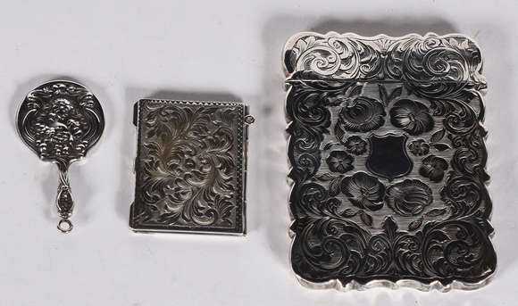 Três peças sendo ,porta cartão de prata , porta retrato duplo 3x4 e mini espelho ( 6 cm de altura)