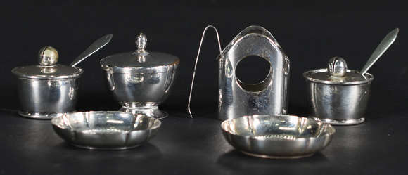 Cinco pequenas peças , sendo : a) par de saleiros com colheres de prata 800 mls e interior de cristal; b) Dois pequen...