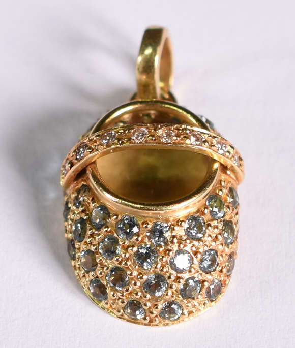 Pingente de ouro amarelo tipo " chinelo " com 5 brilhantes e água marinha ( Por questão de segurança a peça não se e...