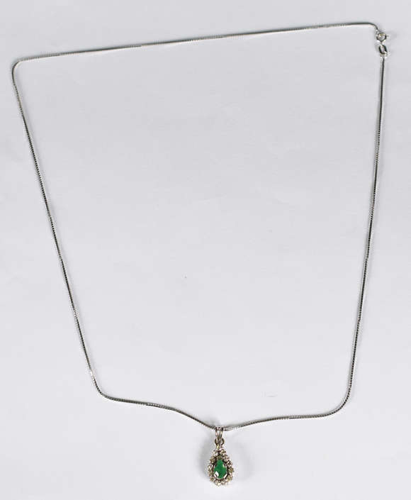Gargantilha de ouro branco com pingente tipo gota com esmeralda e 15 brilhantes ( Por questão de segurança a peça ...