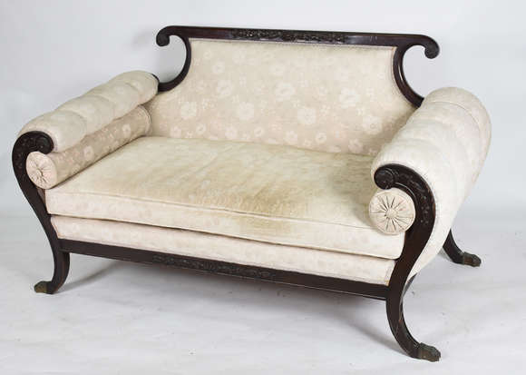 Pequeno Sofá de madeira nobre, estilo Inglês , pés de garra (duas garras estão soltas), estofamento forrado com tec...