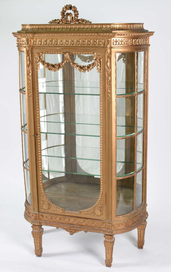 Vitrine estilo frances de madeira dourada, feitio bom bé, ricamente trabalhada com entalhes e guirlandas, tres prate...