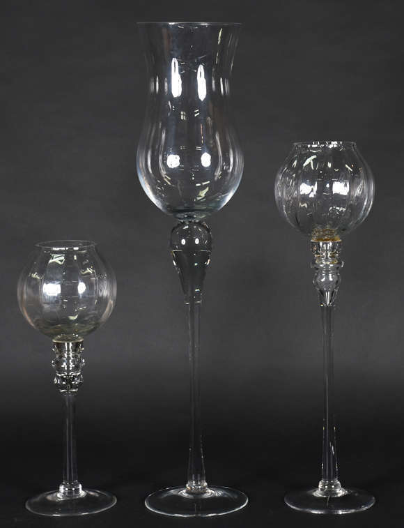 Três grandes castiçais decorativos na forma de taças de vidro .