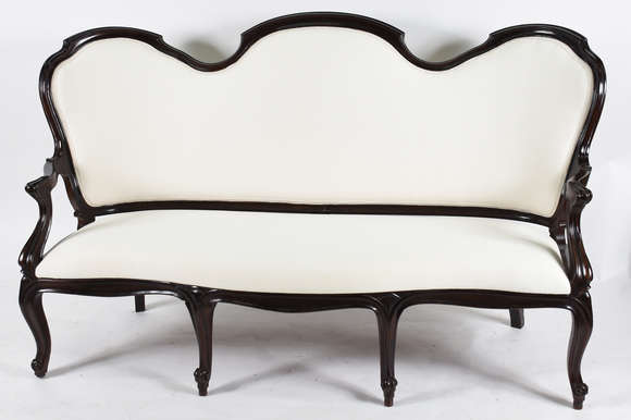 Canapé de madeira nobre estilo Luis XV, século XIX , estofamento forrado com tecido na cor branca .