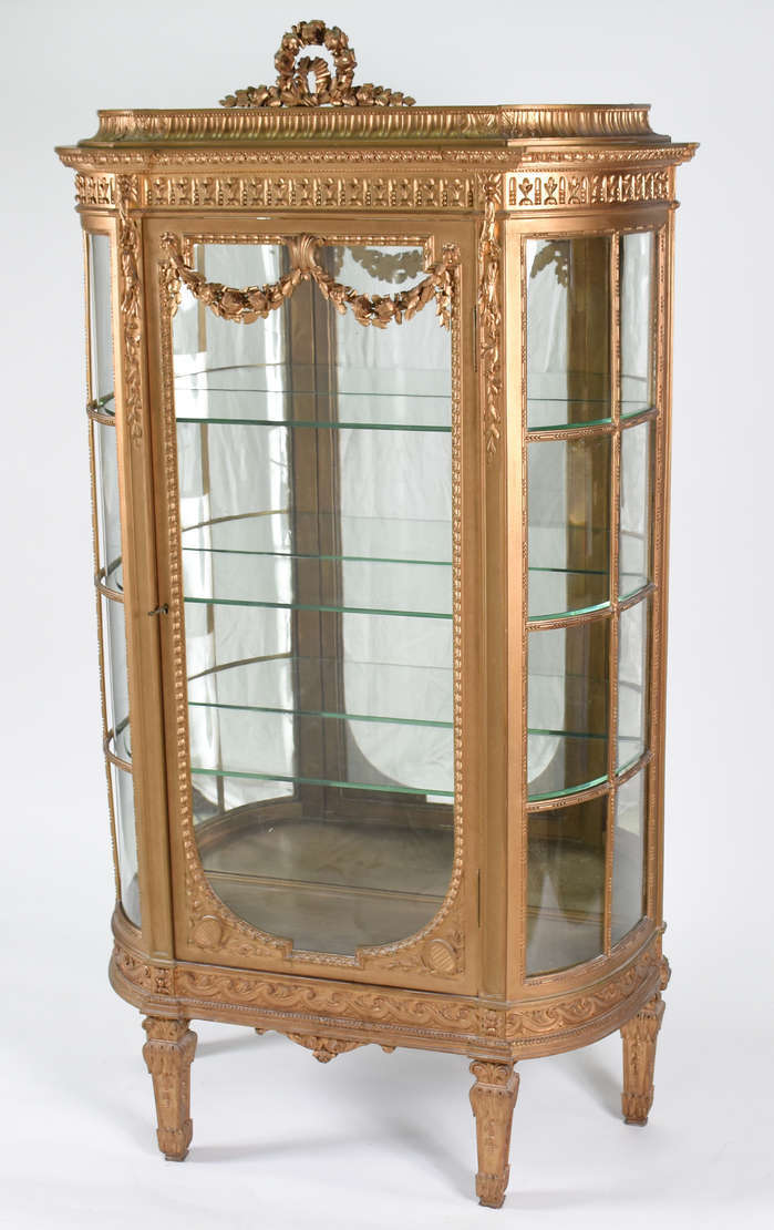 Banqueta de madeira com resquícios de pátina dourada, estilo Luis XV, assento estofado e forrado com tecido bege.
