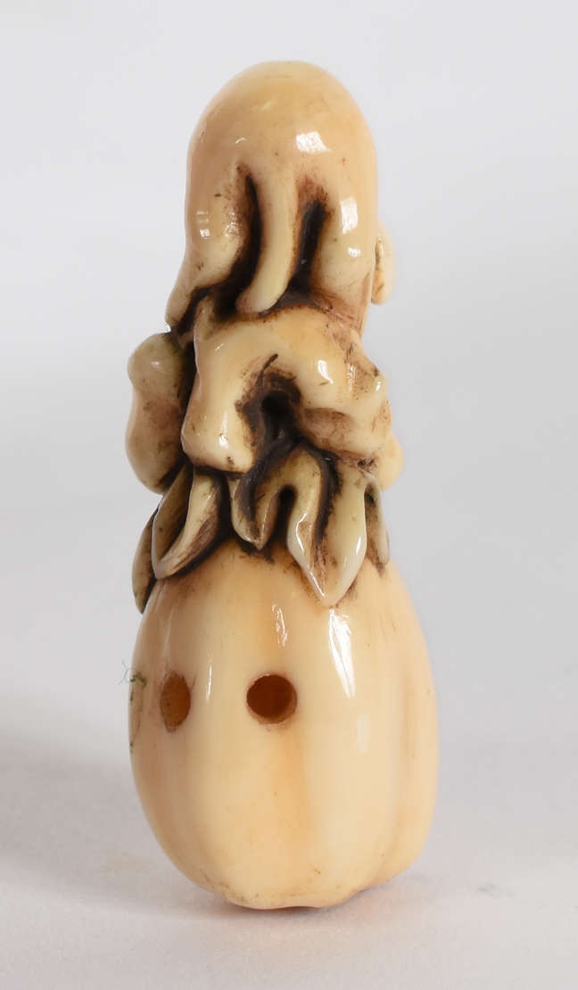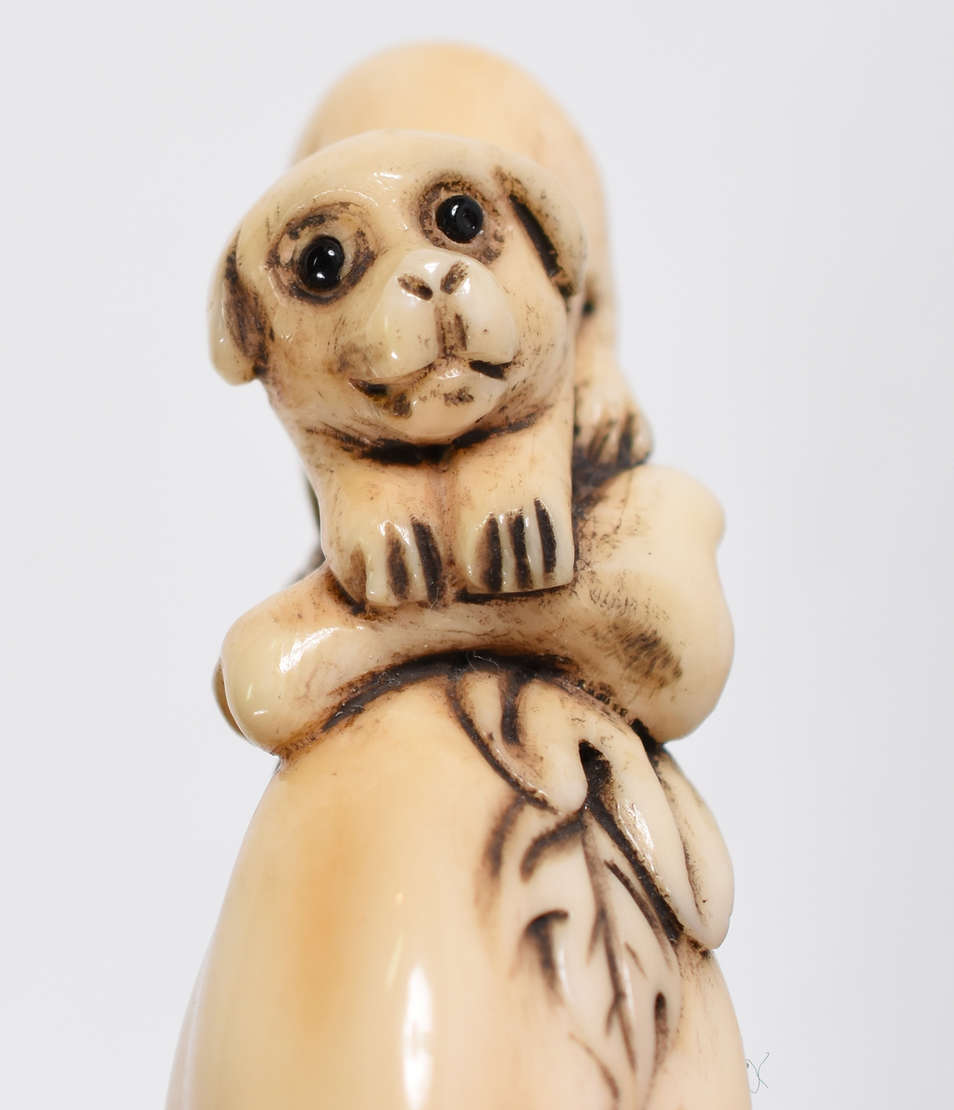 Netsuke de marfim , assinado , representando homem com criança e pêssego.