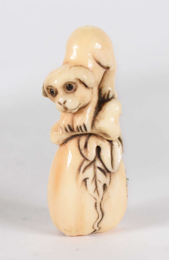 Netsuke de marfim , assinado , representando homem com criança e pêssego.