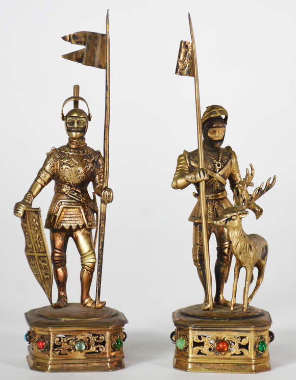 Ourivesaria Alemã - Duas esculturas em miniatura , representando cavaleiros medievais em seus símbolos heráldicos . P...