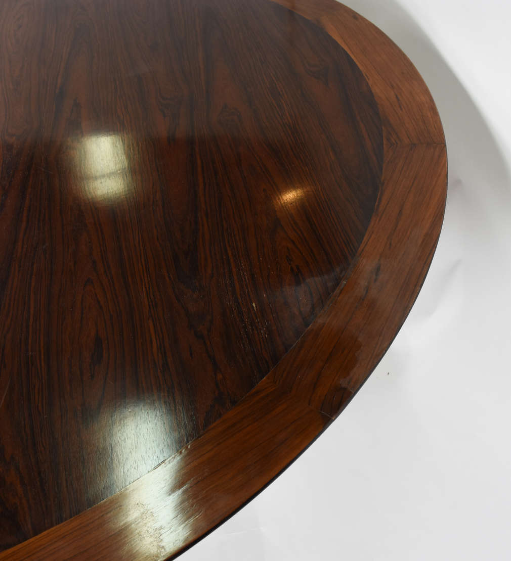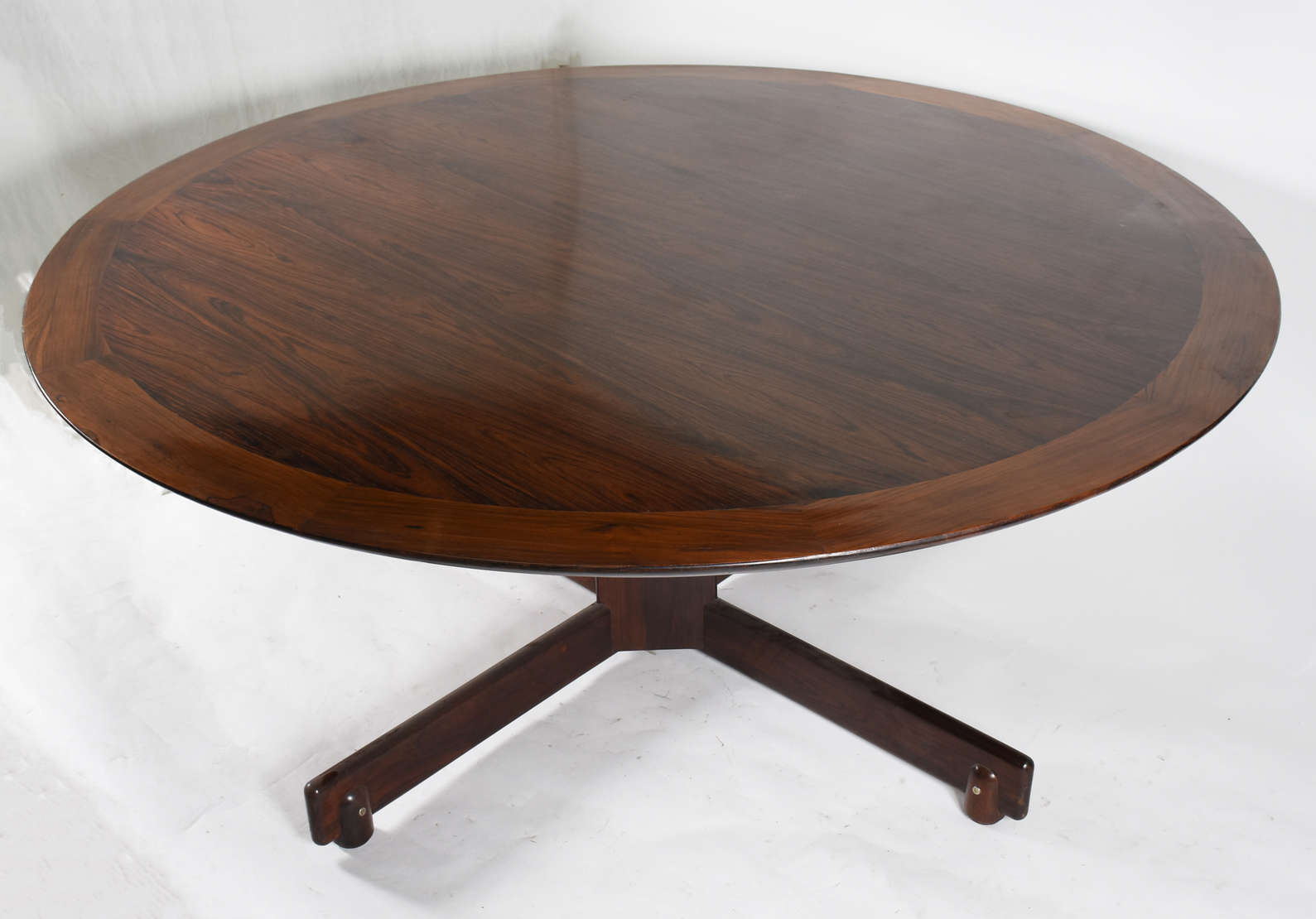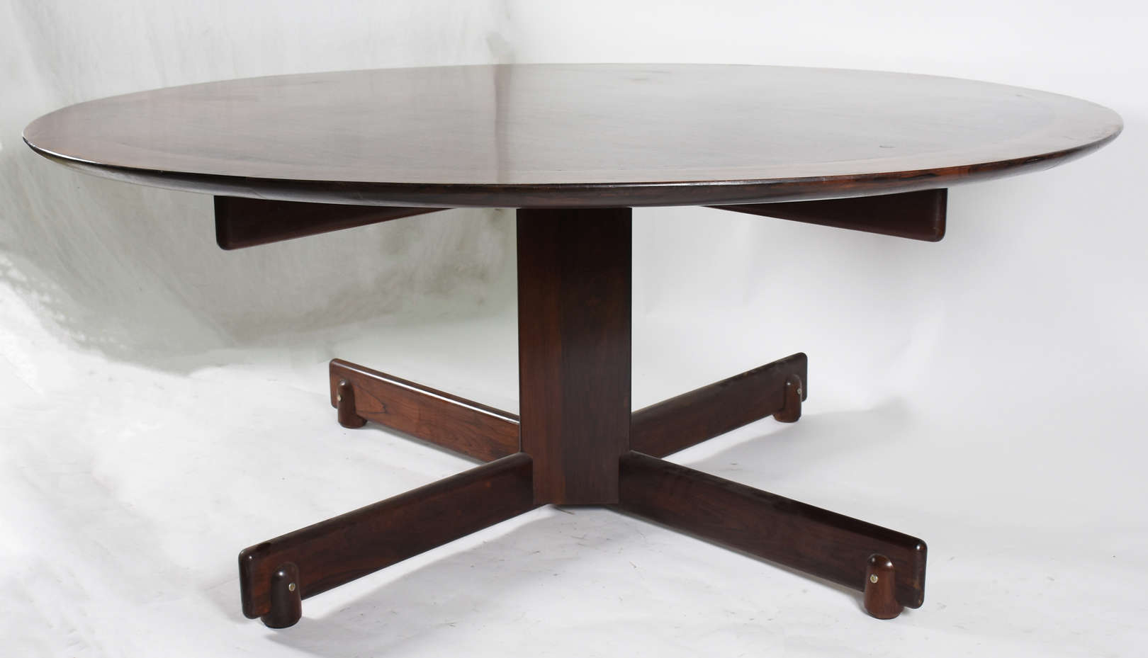 Mesa redonda de madeira nobre, pernas ligeiramente arqueadas, saia entalhada.